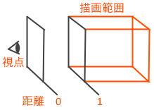 距離が 1 のときを基準にしたいと思います。距離が 1 のときに(3, 3)の範囲が描画領域と同じになるようにします。このときの画像の大きさが3D空間で 1 になるようにします。